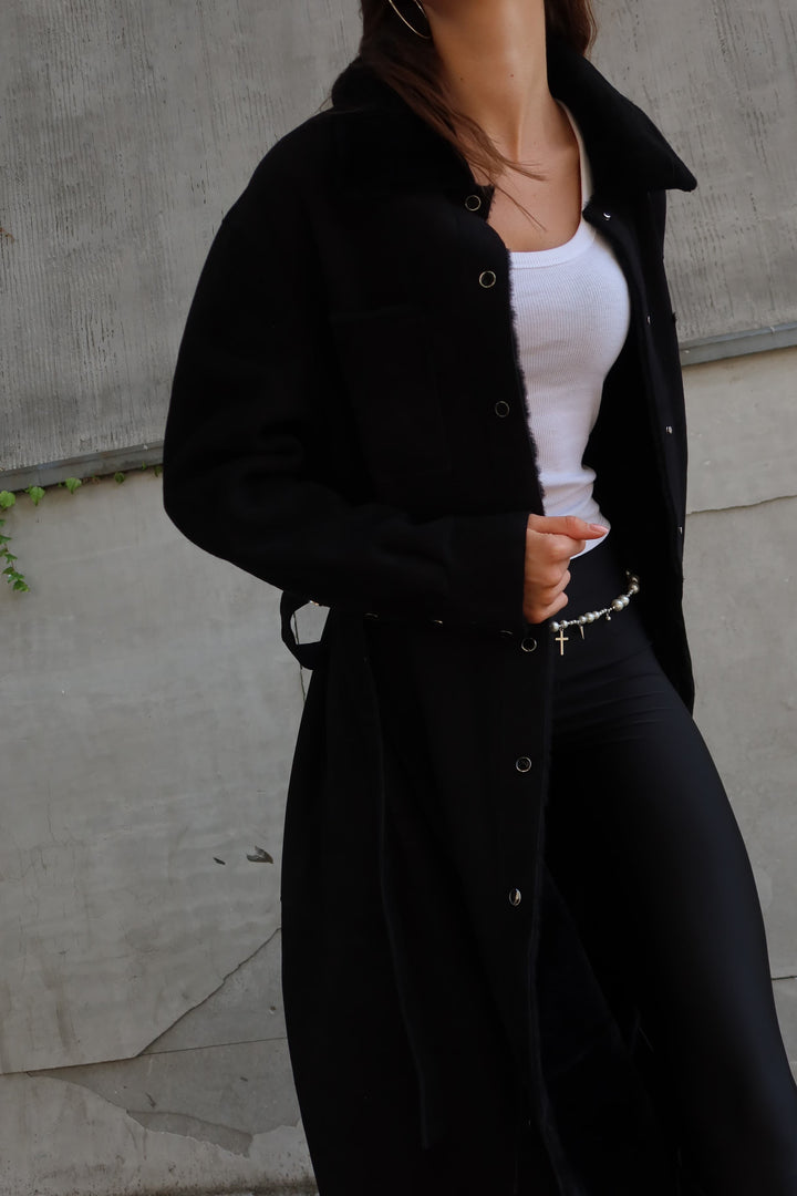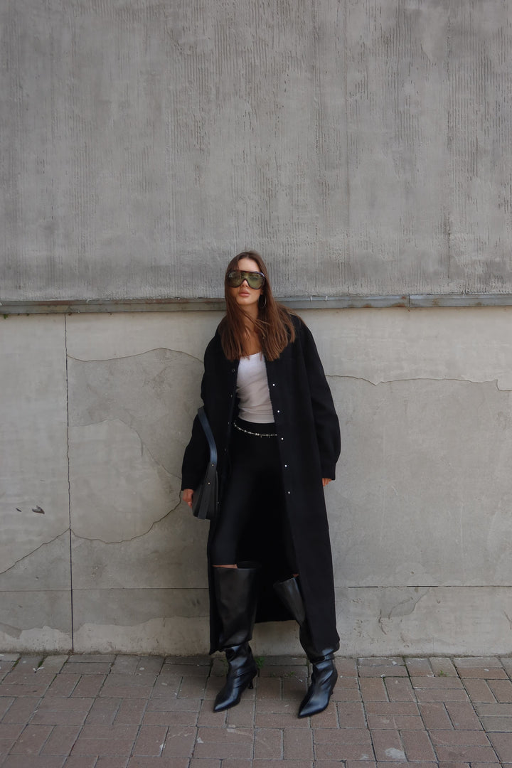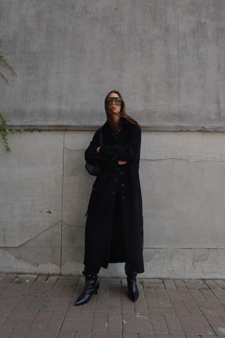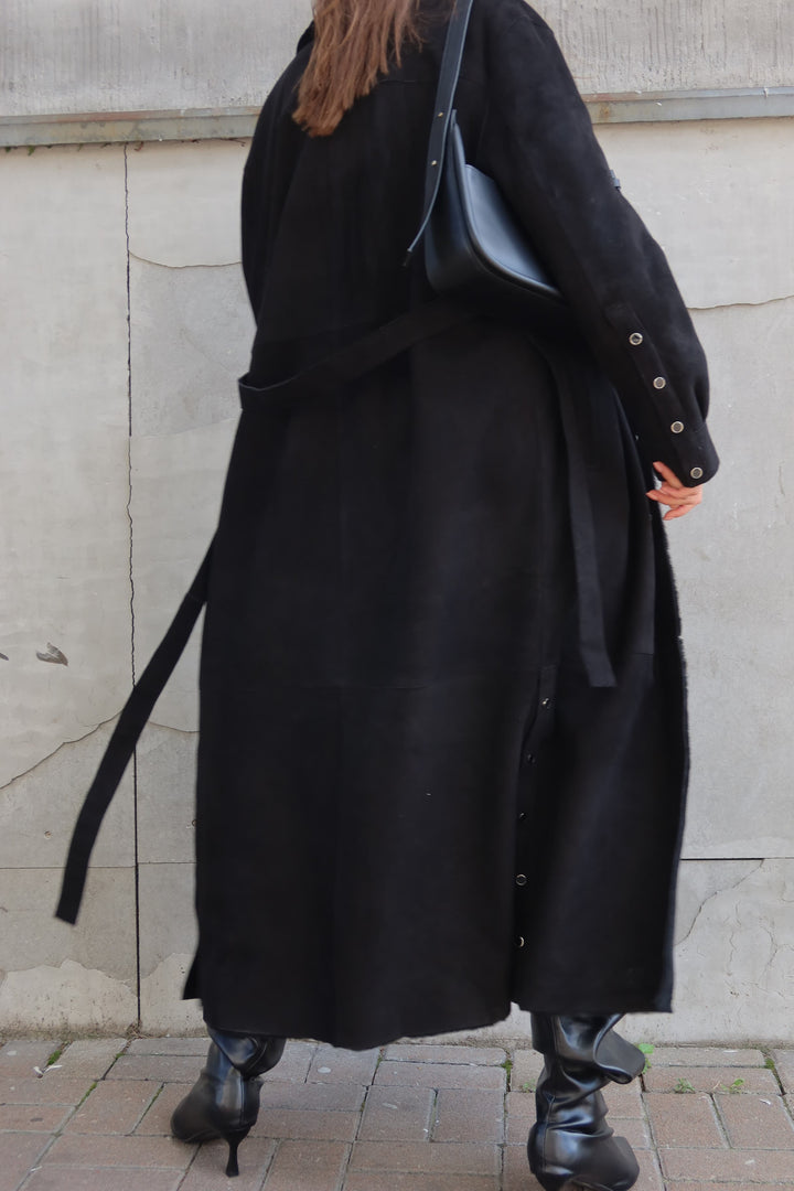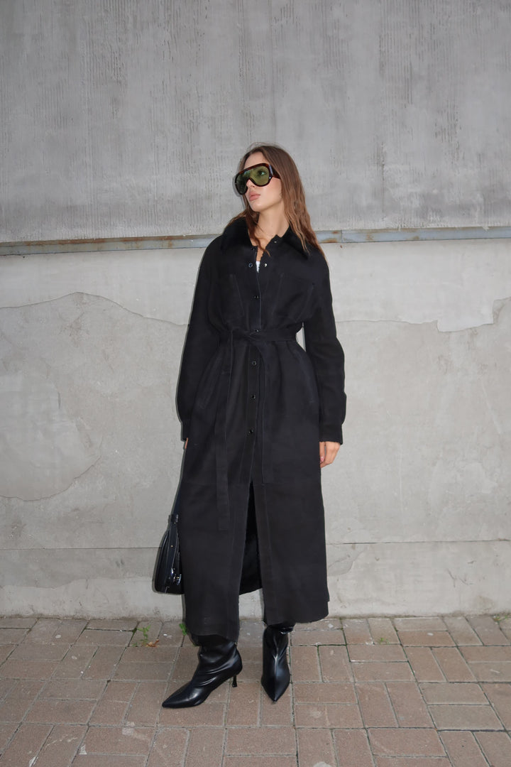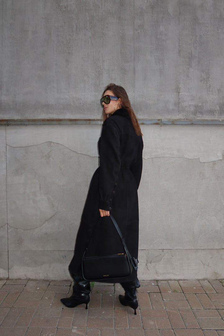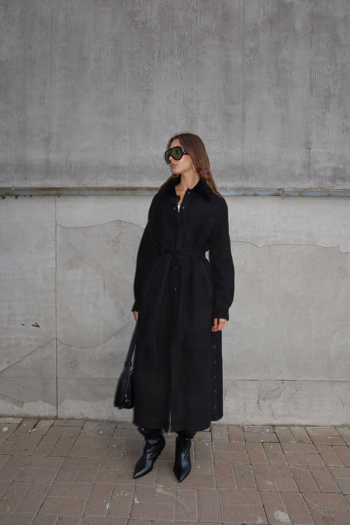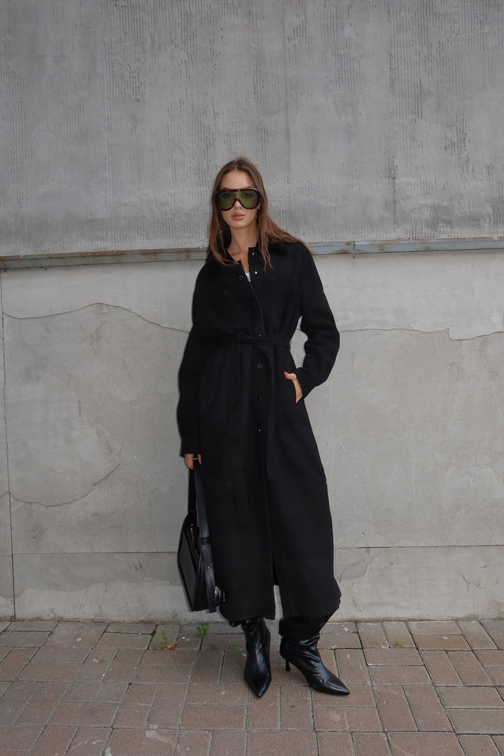 This black merino sheepskin coat offers a seamless fusion of luxury and practicality. Perfect for the modern woman who values superior craftsmanship and versatile styling in her wardrobe. Make a statement this season with an investment piece designed to stand the test of time.