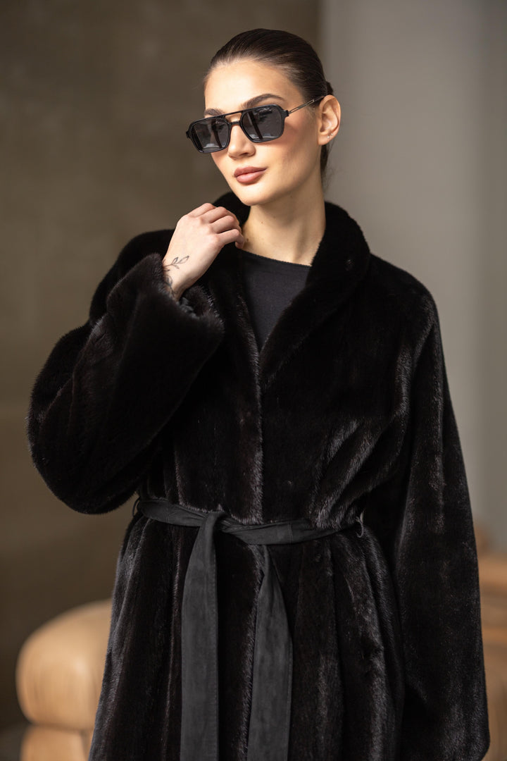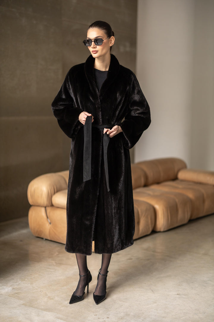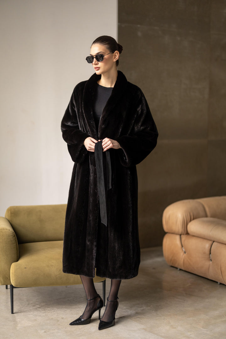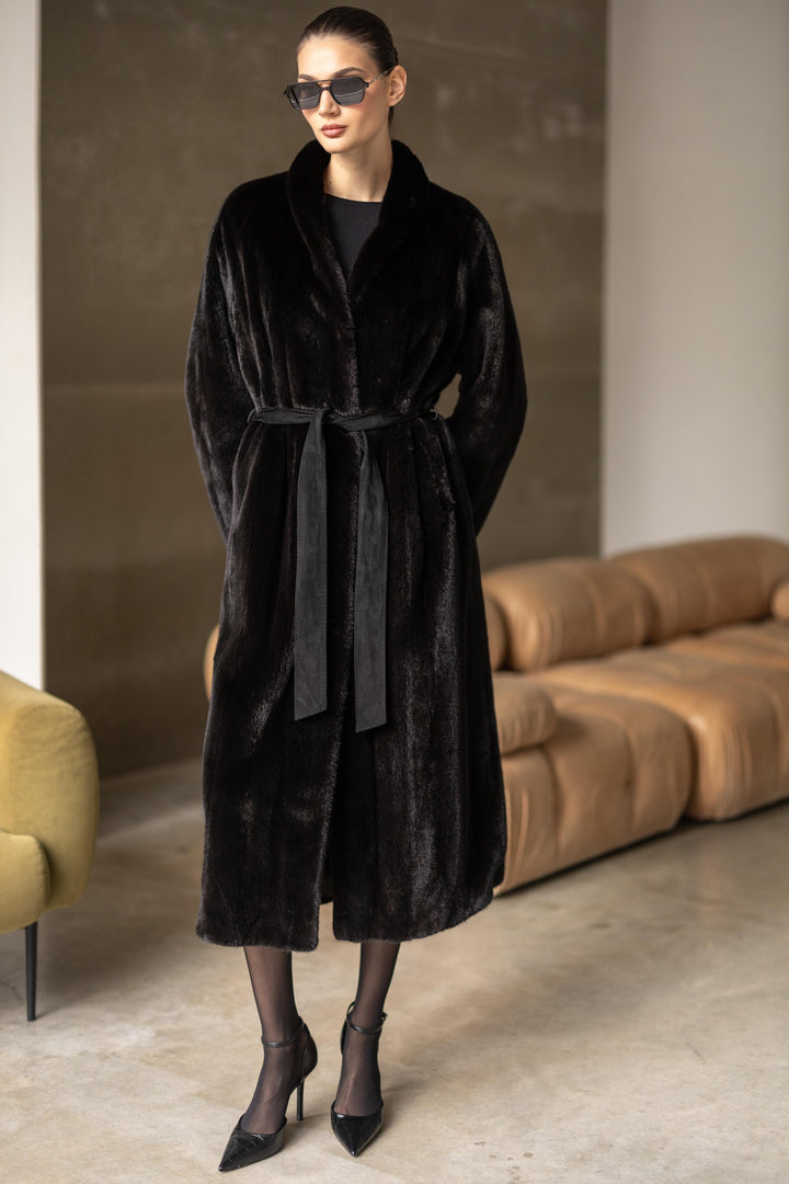 This 130cm long mink fur coat features a classic silhouette enhanced by a sleek self-tie belt, allowing you to adjust the fit to your preference. Its luxurious black hue effortlessly elevates any outfit, making it the perfect choice for elegant evenings or special occasions.