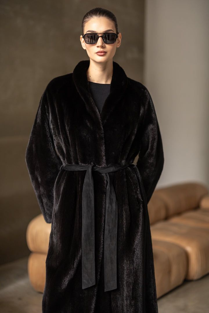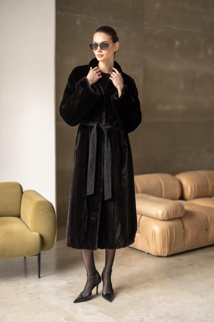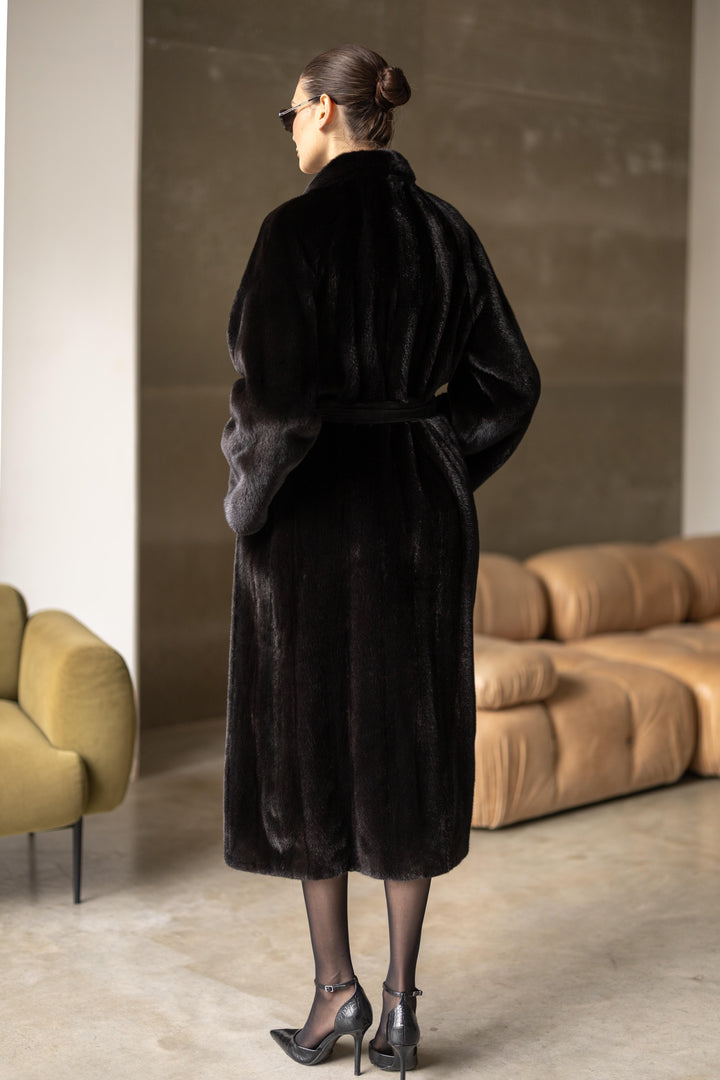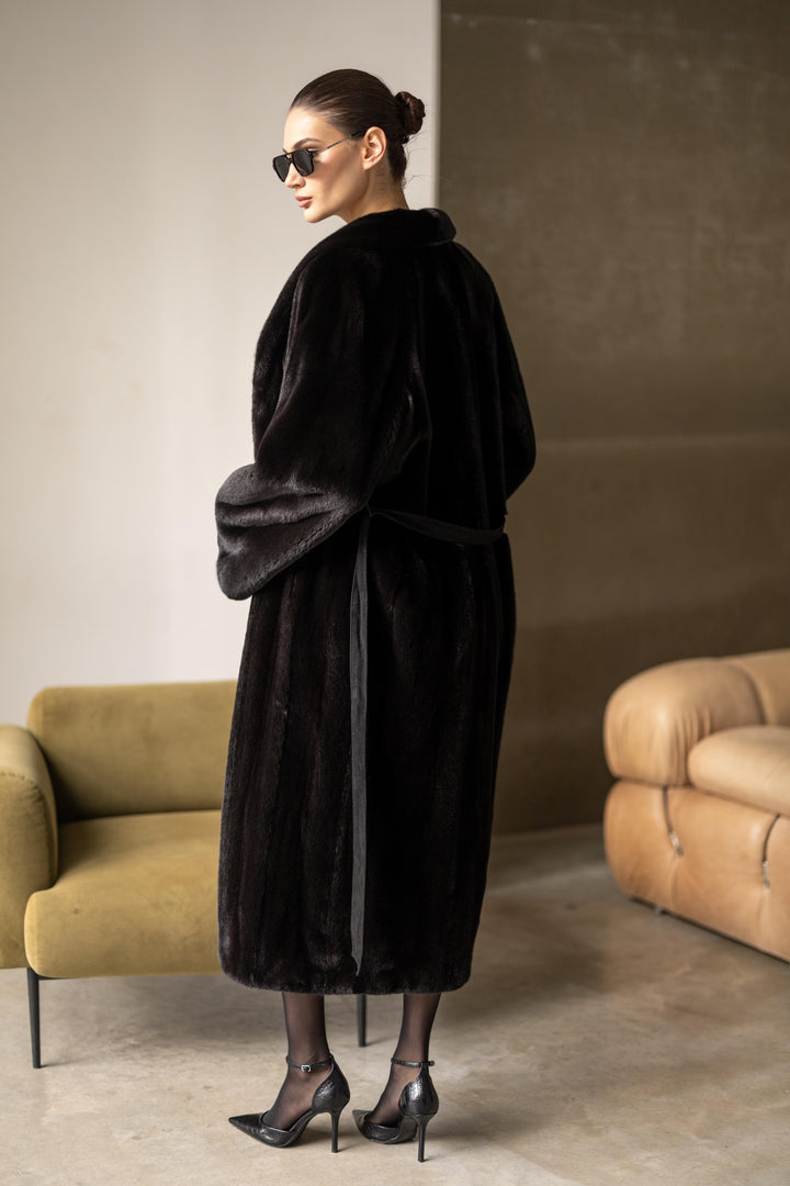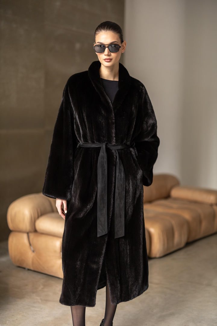This 130cm long mink fur coat features a classic silhouette enhanced by a sleek self-tie belt, allowing you to adjust the fit to your preference. Its luxurious black hue effortlessly elevates any outfit, making it the perfect choice for elegant evenings or special occasions.