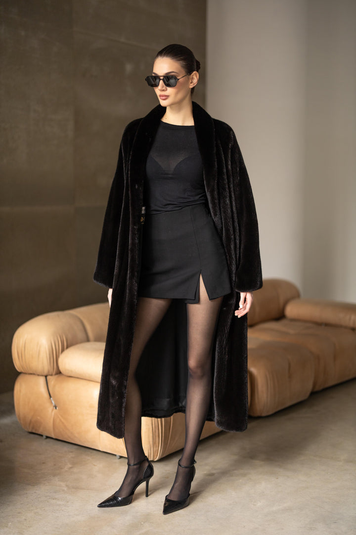 Indulge in unparalleled elegance with this black mink fur coat, designed for those who appreciate timeless sophistication. Crafted with the finest natural mink fur, it combines impeccable style with superior warmth and comfort.