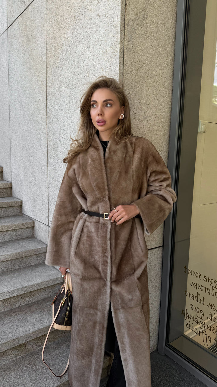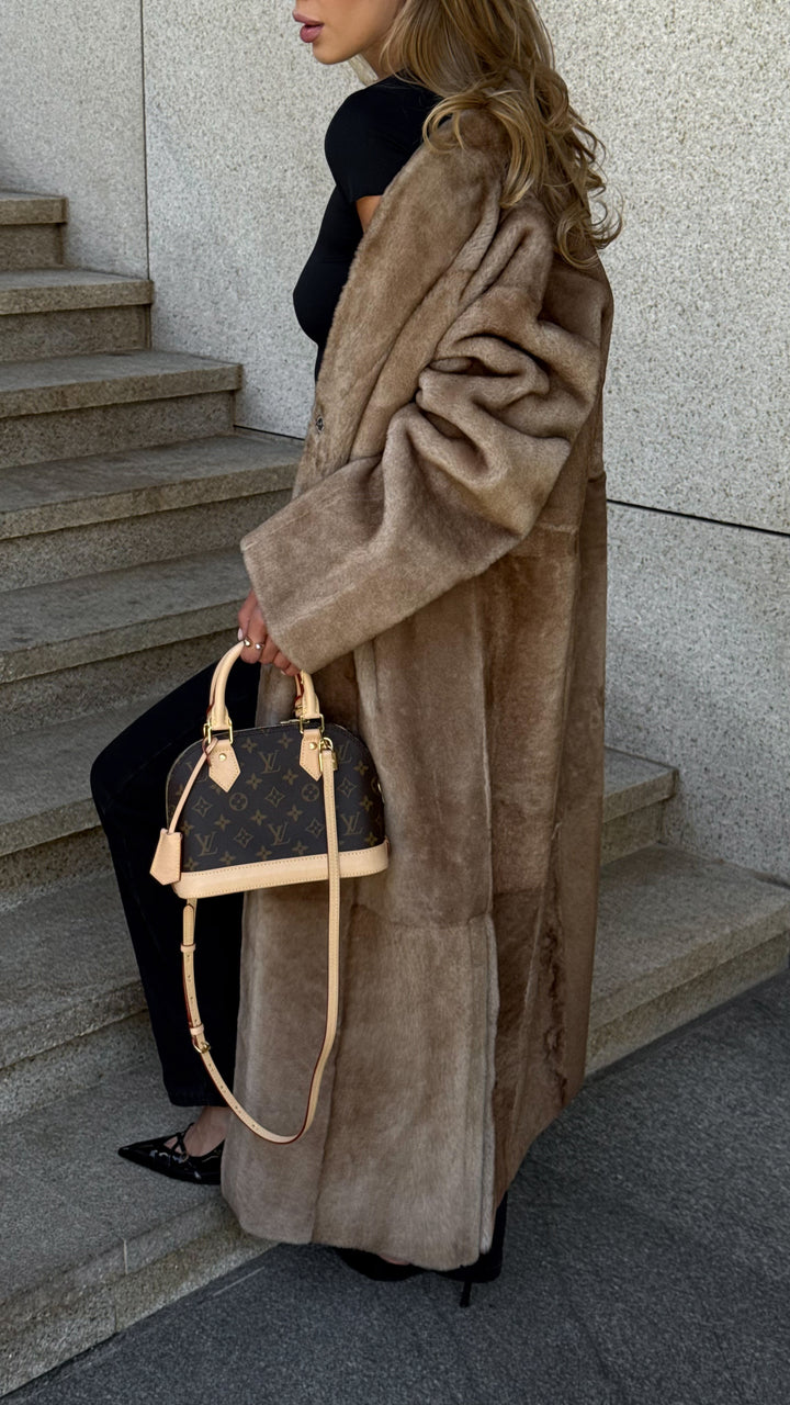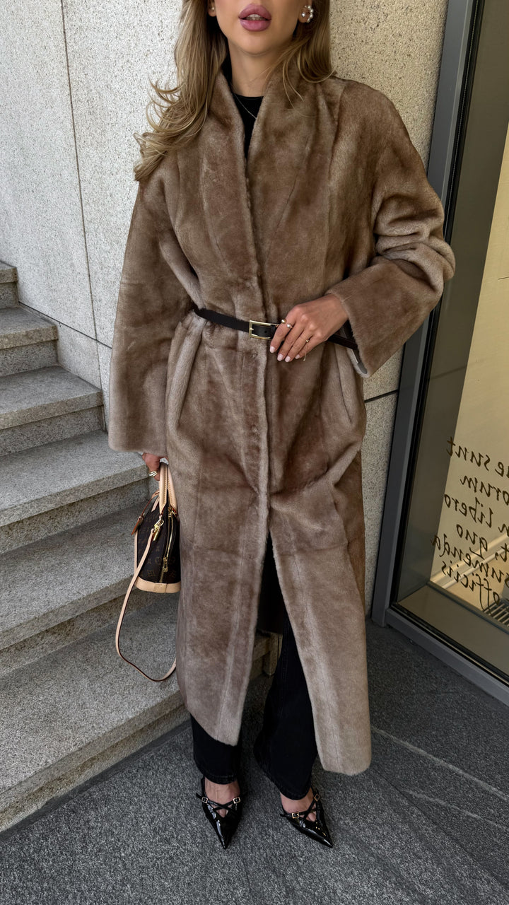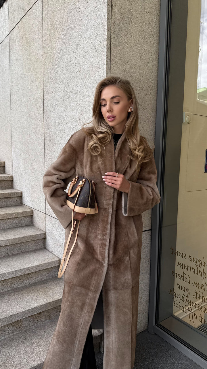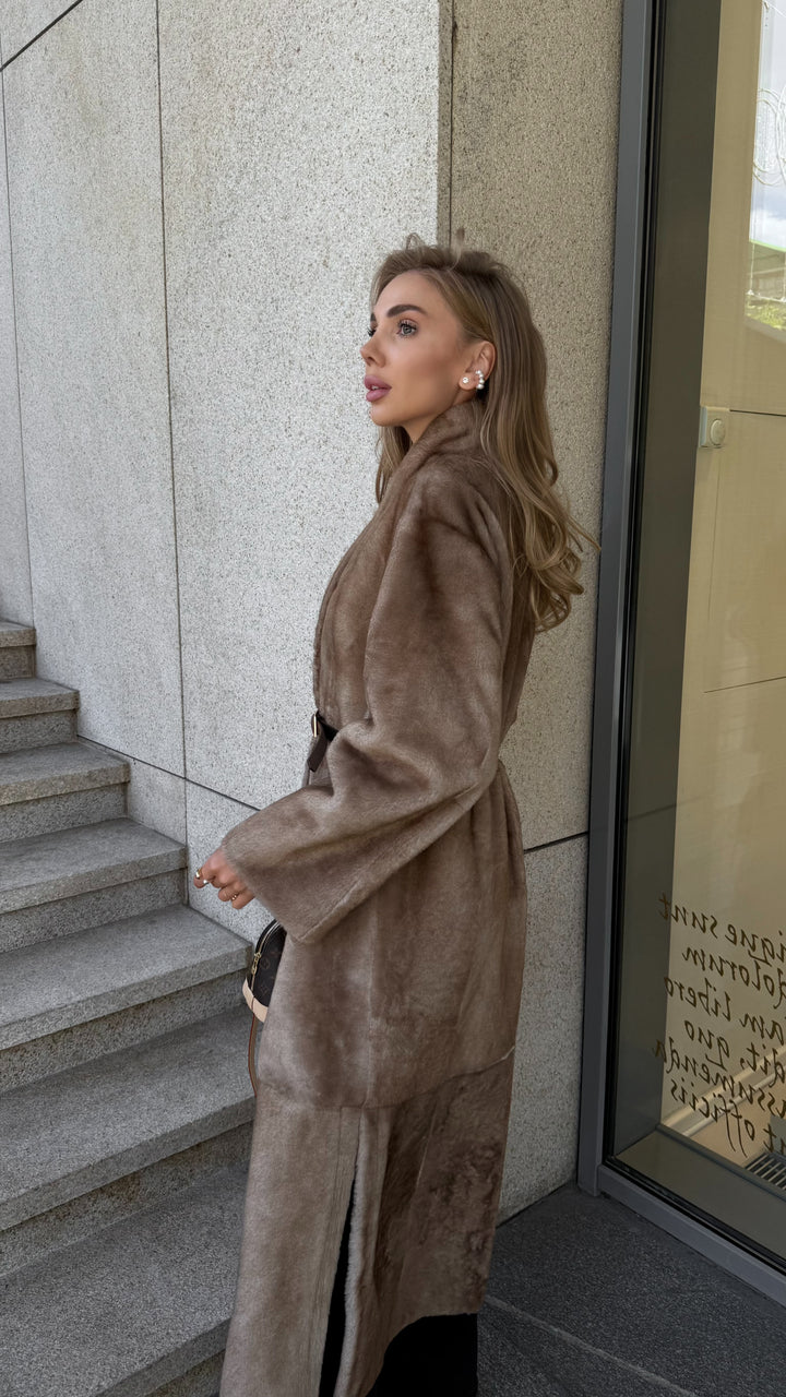 Experience Timeless Elegance with the Honey Taupe Merino Sheepskin Coat