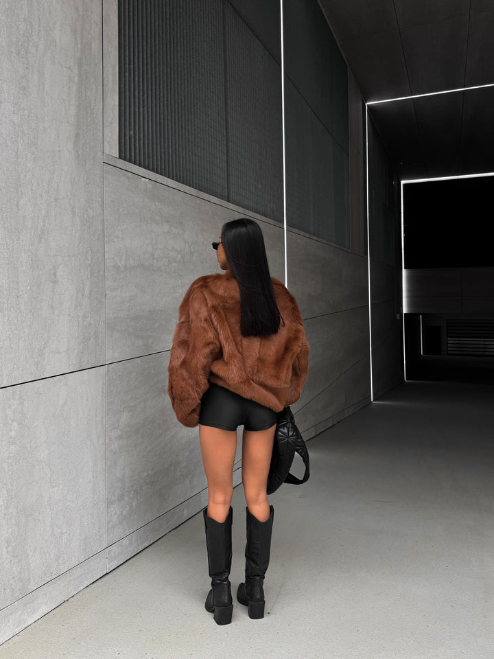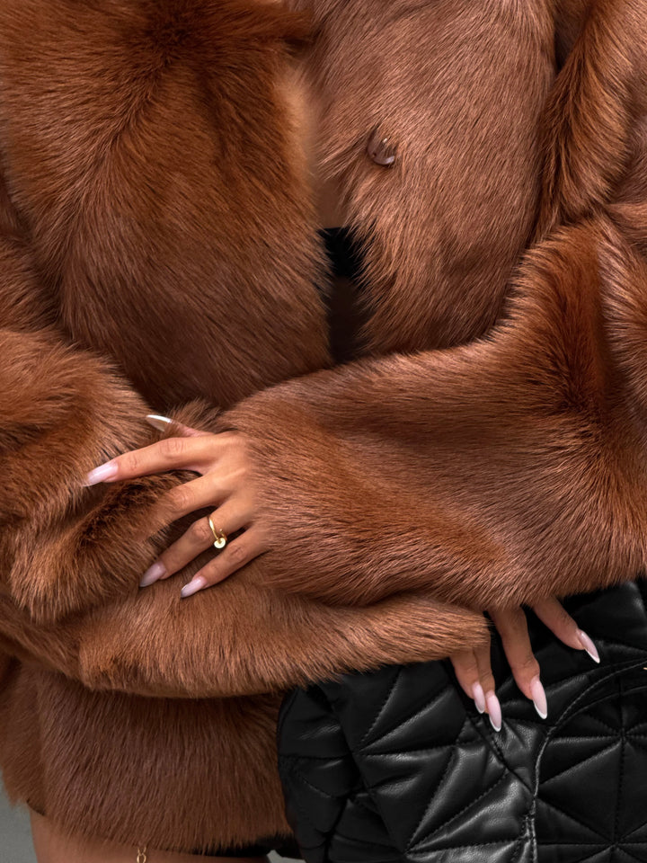 Enhance your wardrobe with the luxurious Natural Sheepskin Curly Jacket in camel.