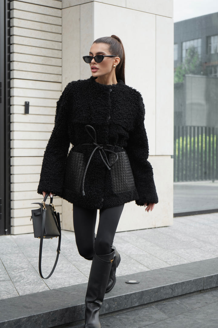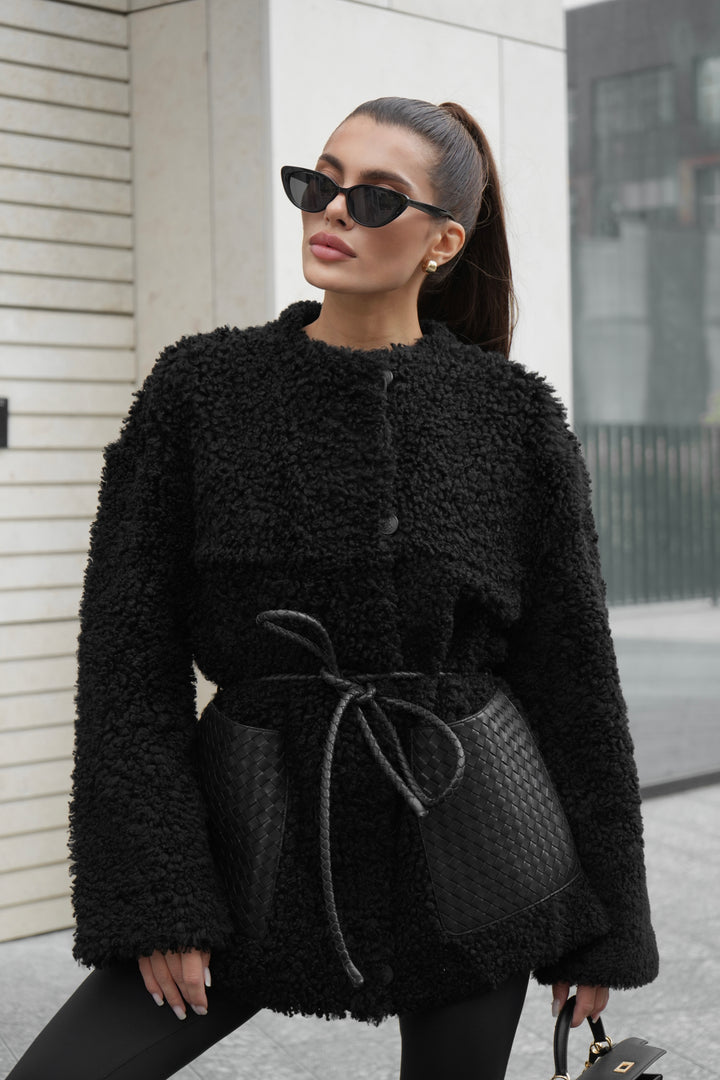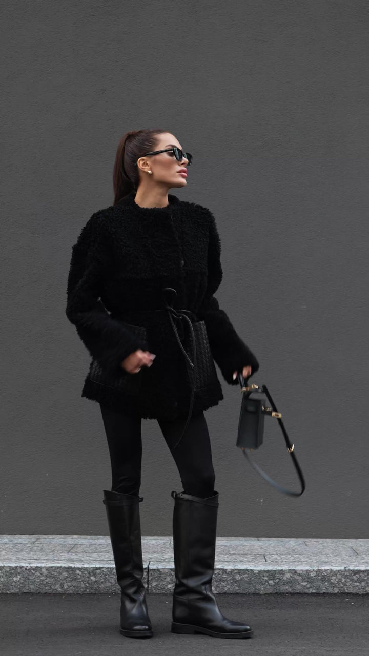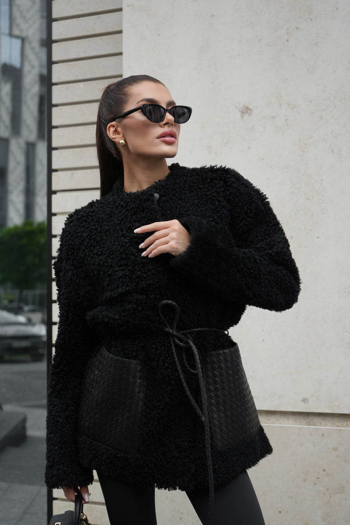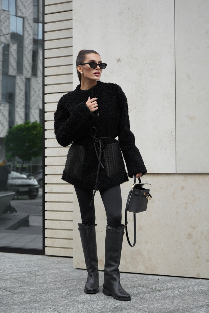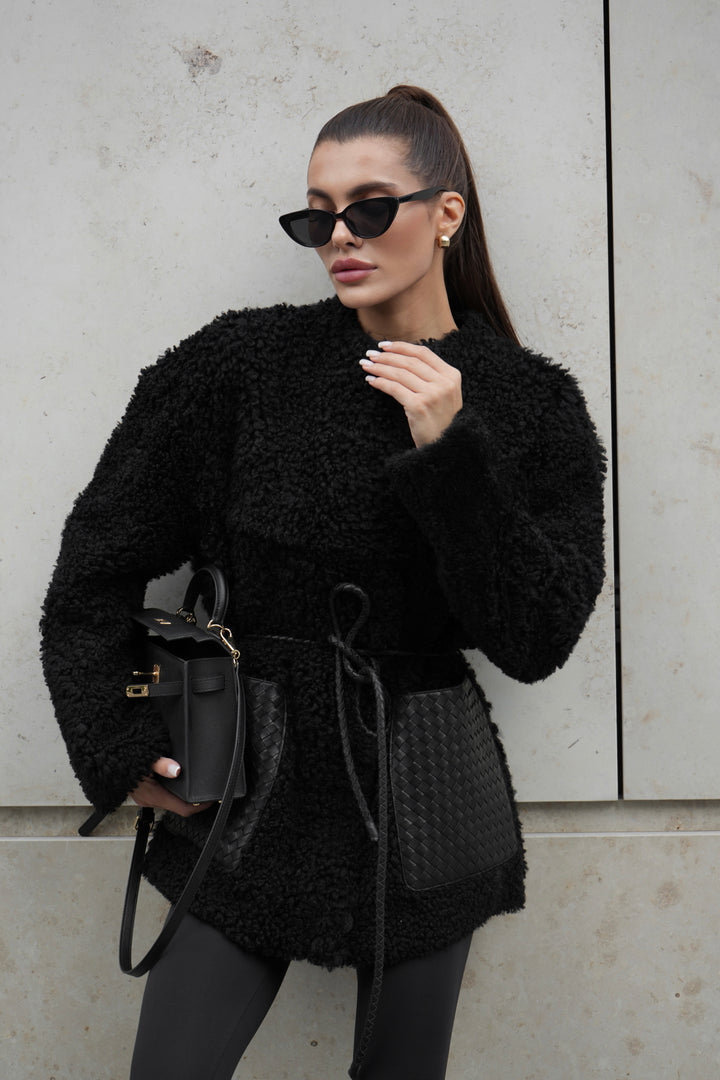 - Elegant Woven Leather Details: Spacious woven leather pockets add a bold and chic contrast to the plush sheepskin texture.
