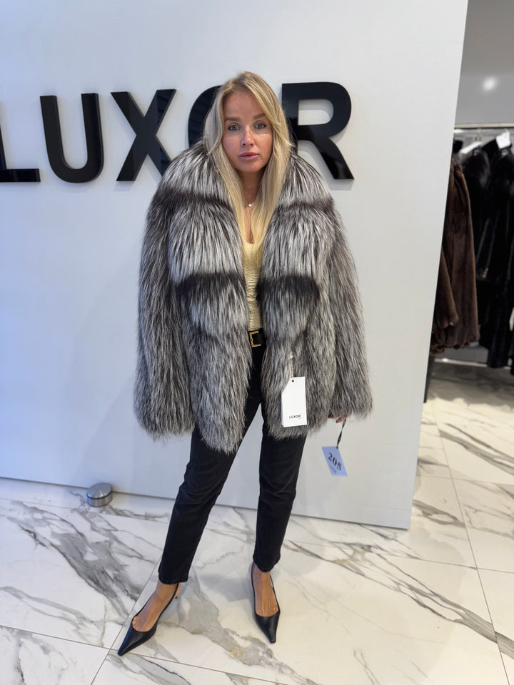 Crafted from the finest quality silver fox fur, this coat is celebrated for its dense, plush texture and exceptional durability. The shimmering, light silvery-gray tones paired with deeper accents create an alluring color variation that garners attention.